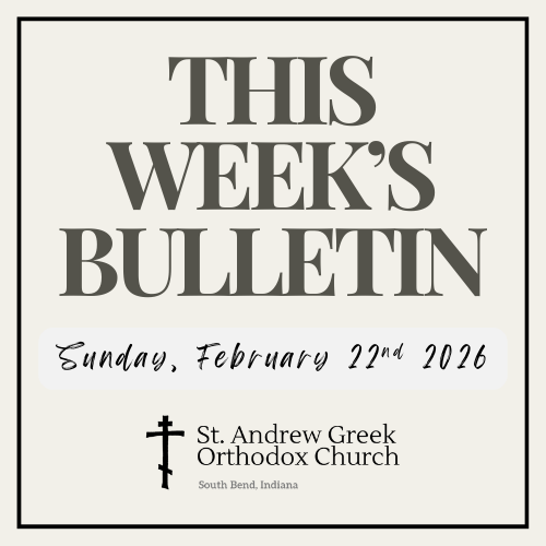Weekly Bulletin Lauren 2/20/26 Weekly Bulletin Lauren 2/20/26 Forgiveness Sunday Click the image for a copy of this week’s bulletin Read More Weekly Bulletin Lauren 2/13/26 Weekly Bulletin Lauren 2/13/26 Judgment Sunday Click the image for a copy of this week’s bulletin Read More Weekly Bulletin Lauren 2/6/26 Weekly Bulletin Lauren 2/6/26 Sunday of the Prodigal Son Click the image for a copy of this week’s bulletin Read More Weekly Bulletin Lauren 1/30/26 Weekly Bulletin Lauren 1/30/26 Sunday of the Publican and Pharisee Click the image for a copy of this week’s bulletin Read More Weekly Bulletin Lauren 1/23/26 Weekly Bulletin Lauren 1/23/26 15th Sunday of Luke Click the image for a copy of this week’s bulletin Read More Weekly Bulletin Lauren 1/16/26 Weekly Bulletin Lauren 1/16/26 12th Sunday of Luke Click the image for a copy of this week’s bulletin Read More Older Posts