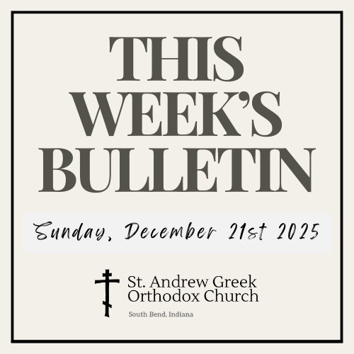 Weekly Bulletin Lauren 12/19/25 Weekly Bulletin Lauren 12/19/25 Sunday before the Nativity Click the image for a copy of this week’s bulletin Read More Weekly Bulletin Lauren 12/12/25 Weekly Bulletin Lauren 12/12/25 11th Sunday of Luke Click the image for a copy of this week’s bulletin Read More Weekly Bulletin Lauren 12/5/25 Weekly Bulletin Lauren 12/5/25 10th Sunday of Luke Click the image for a copy of this week’s bulletin Read More Weekly Bulletin Lauren 11/28/25 Weekly Bulletin Lauren 11/28/25 Andrew the First Called Apostle Click the image for a copy of this week’s bulletin Read More Weekly Bulletin Lauren 11/21/25 Weekly Bulletin Lauren 11/21/25 9th Sunday of Luke Click the image for a copy of this week’s bulletin Read More Weekly Bulletin Lauren 11/14/25 Weekly Bulletin Lauren 11/14/25 Matthew the Apostle & Evangelist Click the image for a copy of this week’s bulletin Read More Older Posts